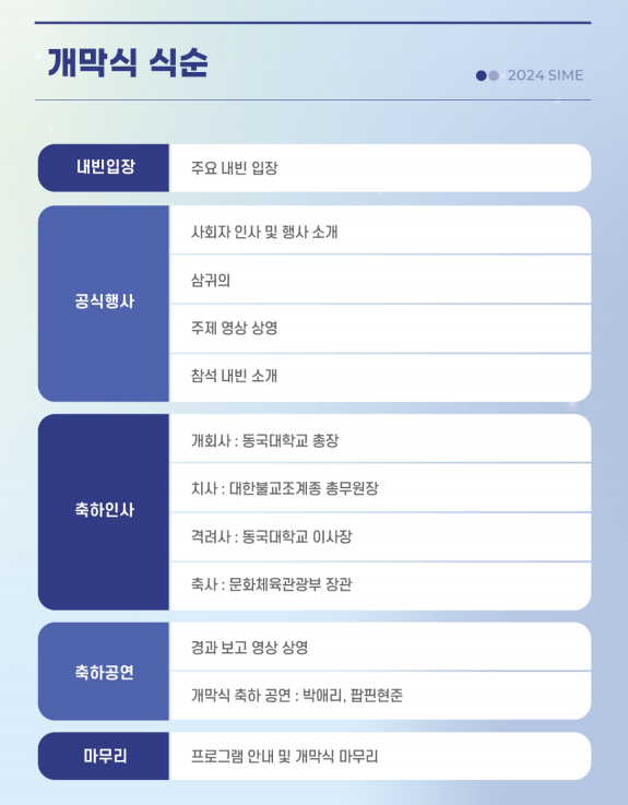 1. - 내빈 축사, 인사말, 개회사 등 개막식 국내·외 축사 인사 관리(사전 영상 촬영/현장 진행을 포괄 진행, 한국어 및 영어 자막 포함)