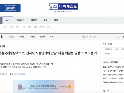 [뉴스다이제스트] 제4회 서울국제명상엑스포, 선지식·지성인과의 만남 ‘나를 깨닫는 명상’ 프로그램 개최