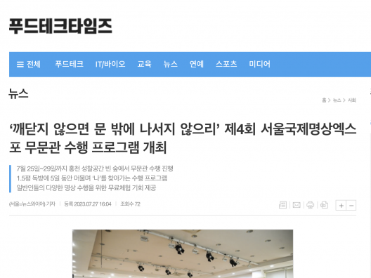 [푸드테크타임즈] ‘깨닫지 않으면 문 밖에 나서지 않으리’ 제4회 서울국제명상엑스포 무문관 수행 프로그램 개최